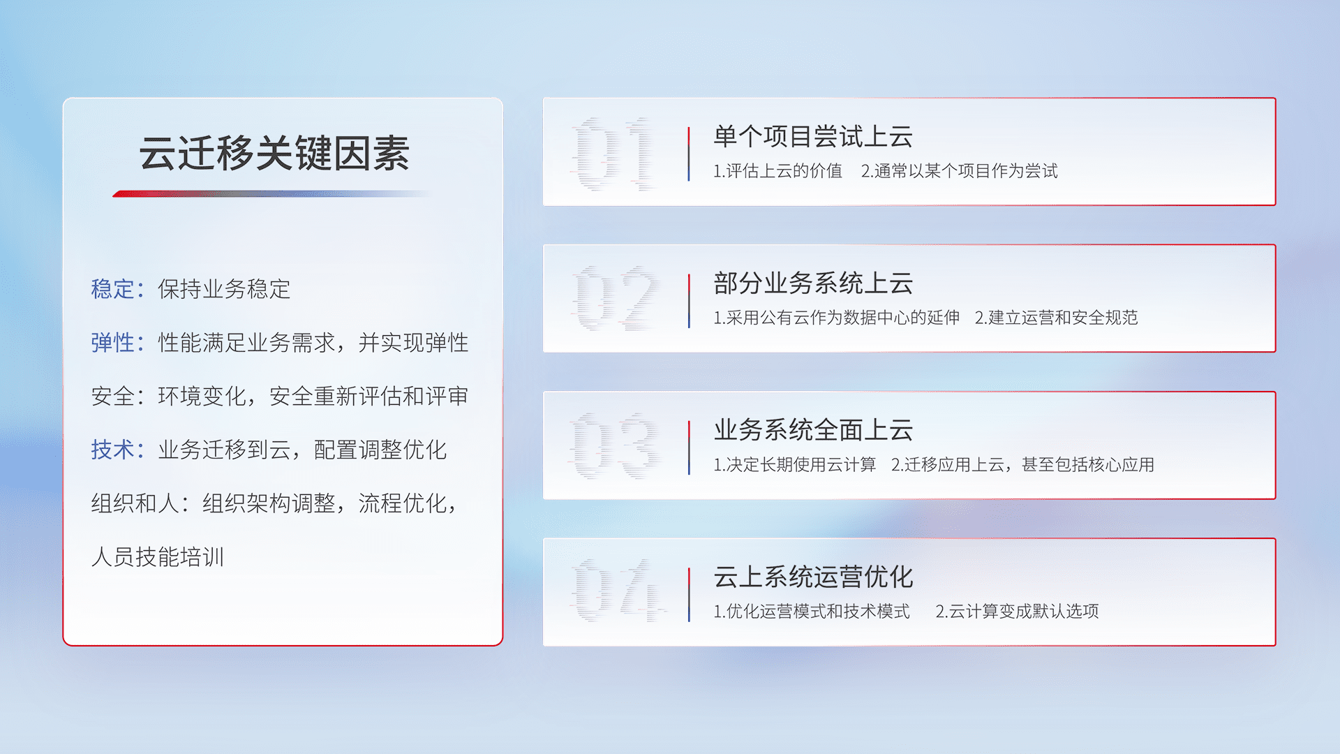 结合实际业务,,,从规划设计、、、、云平台选型、、、、云原生改造、、、、数据迁移、、、、集成交付,,迁移全过程为客户识别最佳上云路径,,做好风险识别管理,,,设计网络架构、、、身份权限、、、、安全审计合规、、、、操作审计、、、、日志审计、、、监控告警策略、、、多站点容灾设计等,,,,对云上基础设施进行整体规划,,,提升IT治理水平,,,以满足弹性、、高可用、、、高性能的需求。。