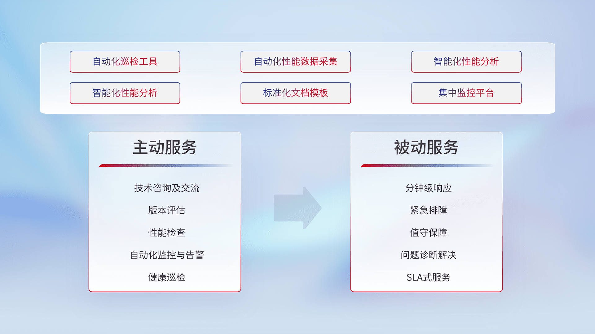 智能化工具和标准化文档,,保障服务质量,,,,提供主动服务(包含技术咨询、、、版本评估、、性能检查、、、、自动化监控与告警、、、健康巡检)和被动服务包含(分钟级响应、、紧急排障、、值守保障、、、、问题诊断解决、、、SLA服务)。。