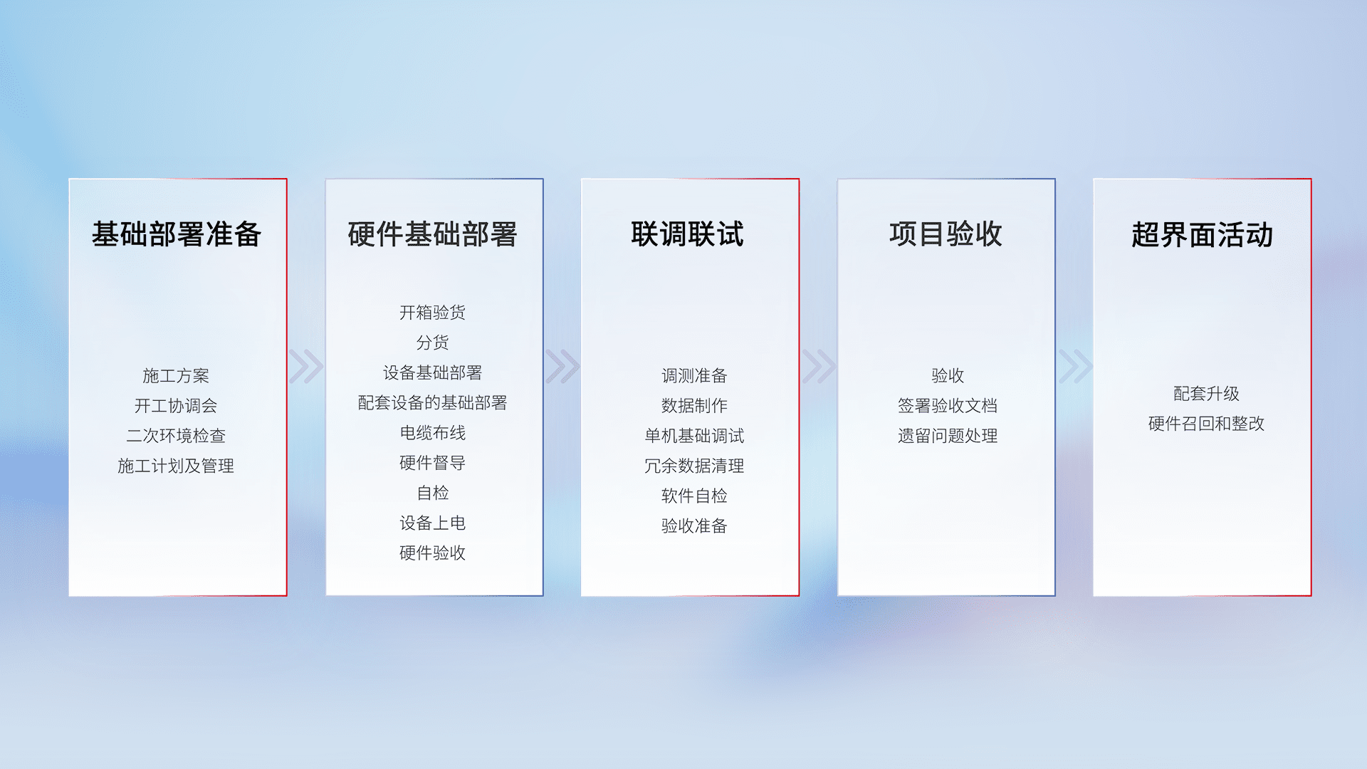 从基础部署准备、、硬件基础部署、、联调联试、、、项目验收、、、越界面活动的全过程可追溯,,,,保证施工质量和进度。。。。